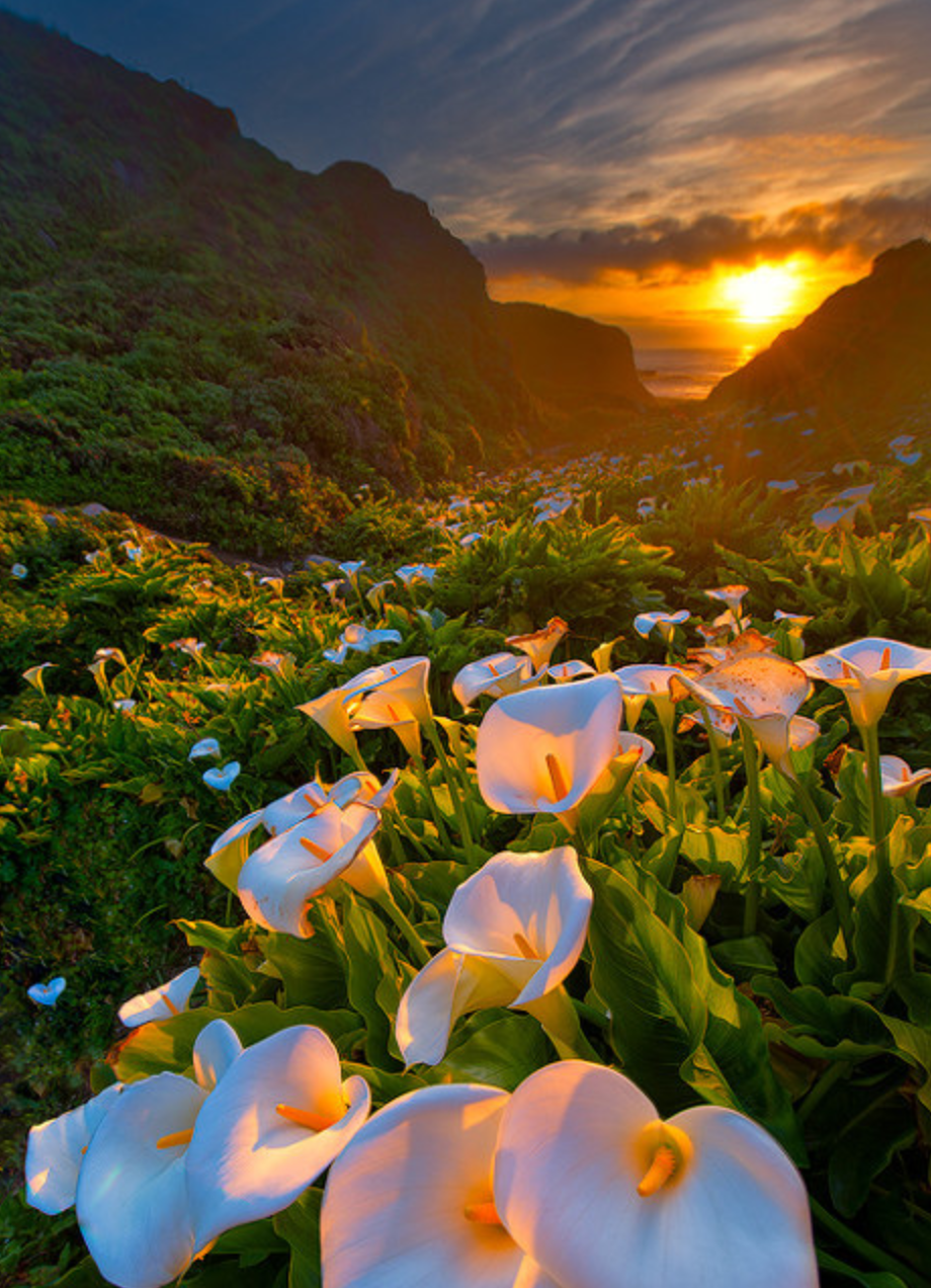 加州1号公路Big Sur附近有个州立公园 Garrapata State Park。那里的一条通海的沟中长有很多野生马蹄莲 (Calla Lily)。每年3-5月,马蹄莲盛开的季节,